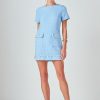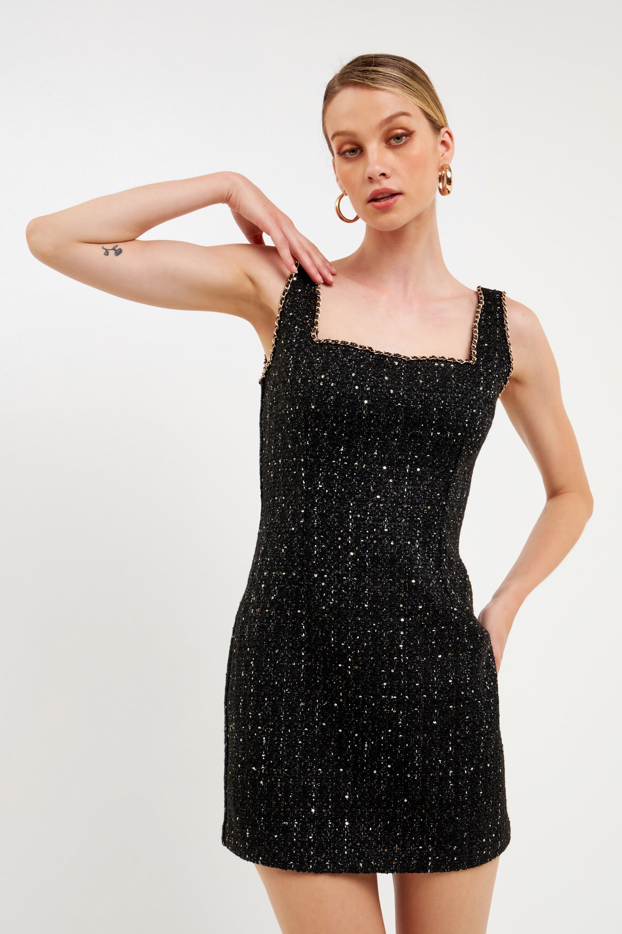 This sequin tweed mini dress is accented with a chain trim, which is made from a high-quality faux leather strip and gold chain.