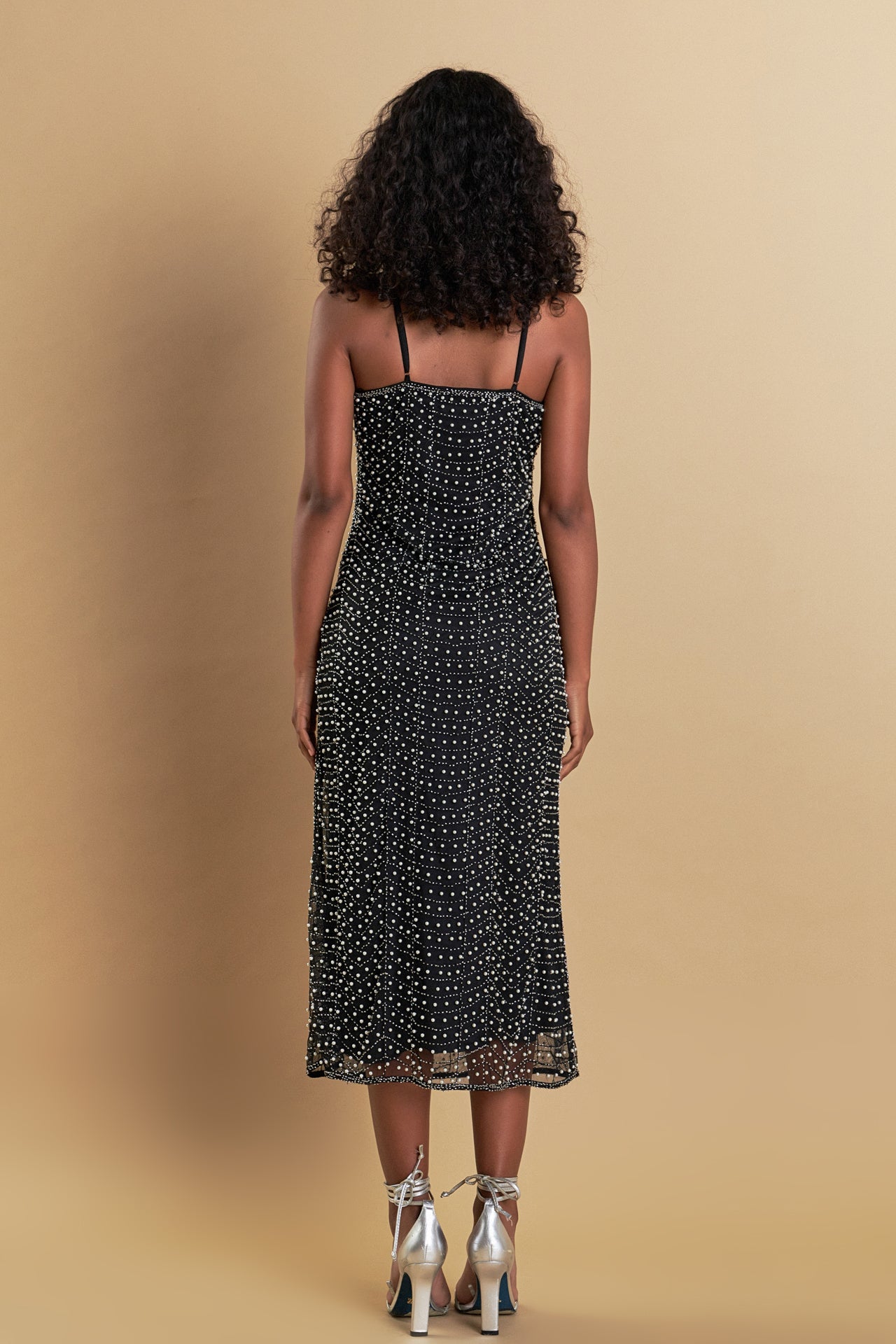 An elegant dress accented with glamorous pearls and beads. Plus, the adjustable straps allow you to get the perfect fit.