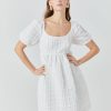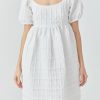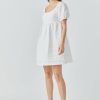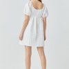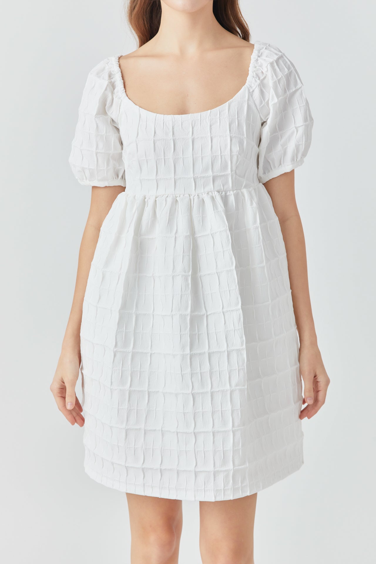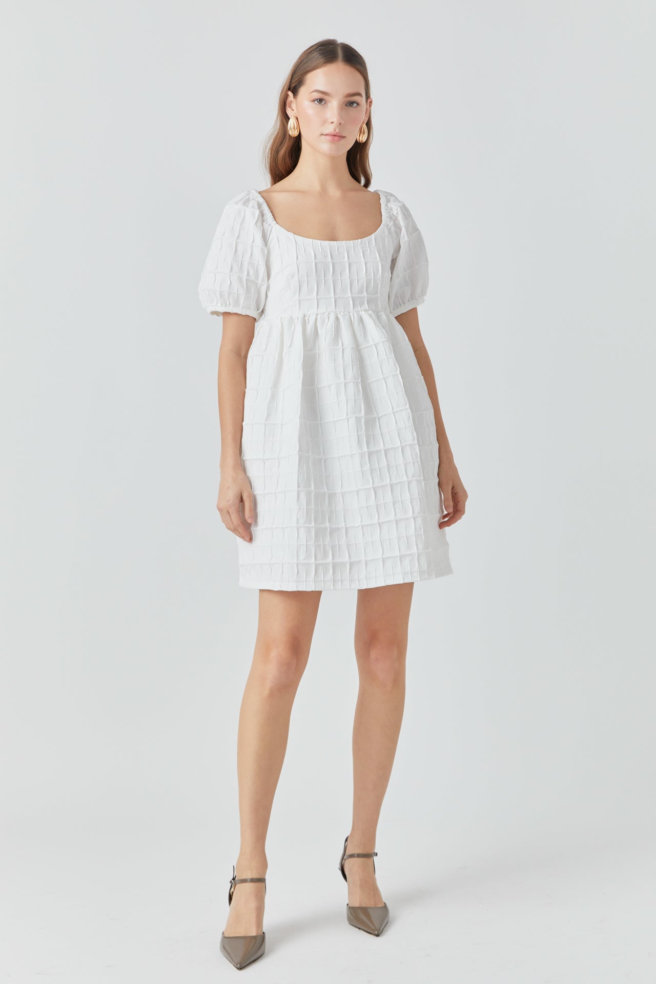 A baby doll mini dress created with textured fabric that features puffy sleeves and a flattering scoop neckline. It’s lined for comfortable all-day wear and has hidden pockets.