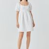 A baby doll mini dress created with textured fabric that features puffy sleeves and a flattering scoop neckline. It’s lined for comfortable all-day wear and has hidden pockets.