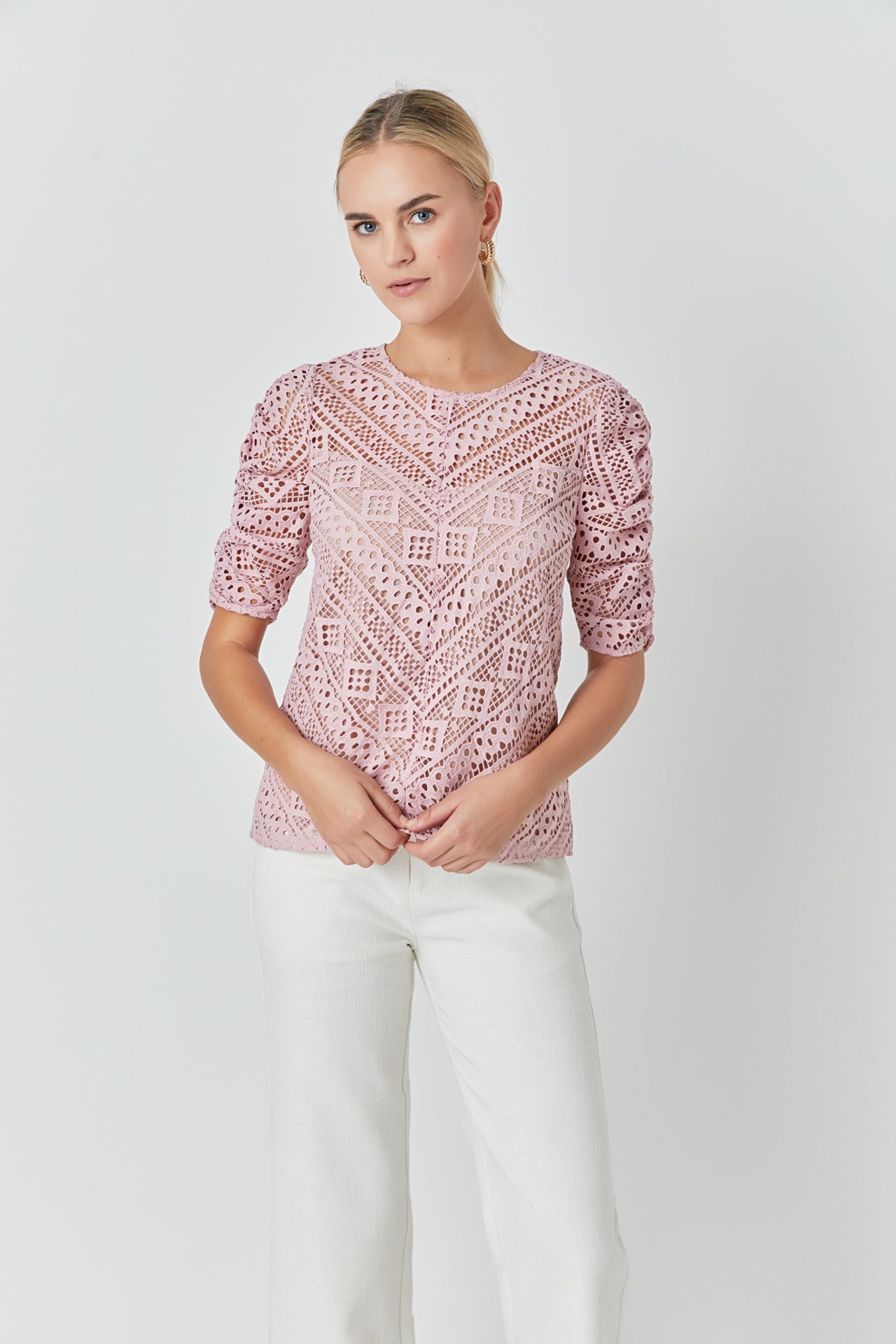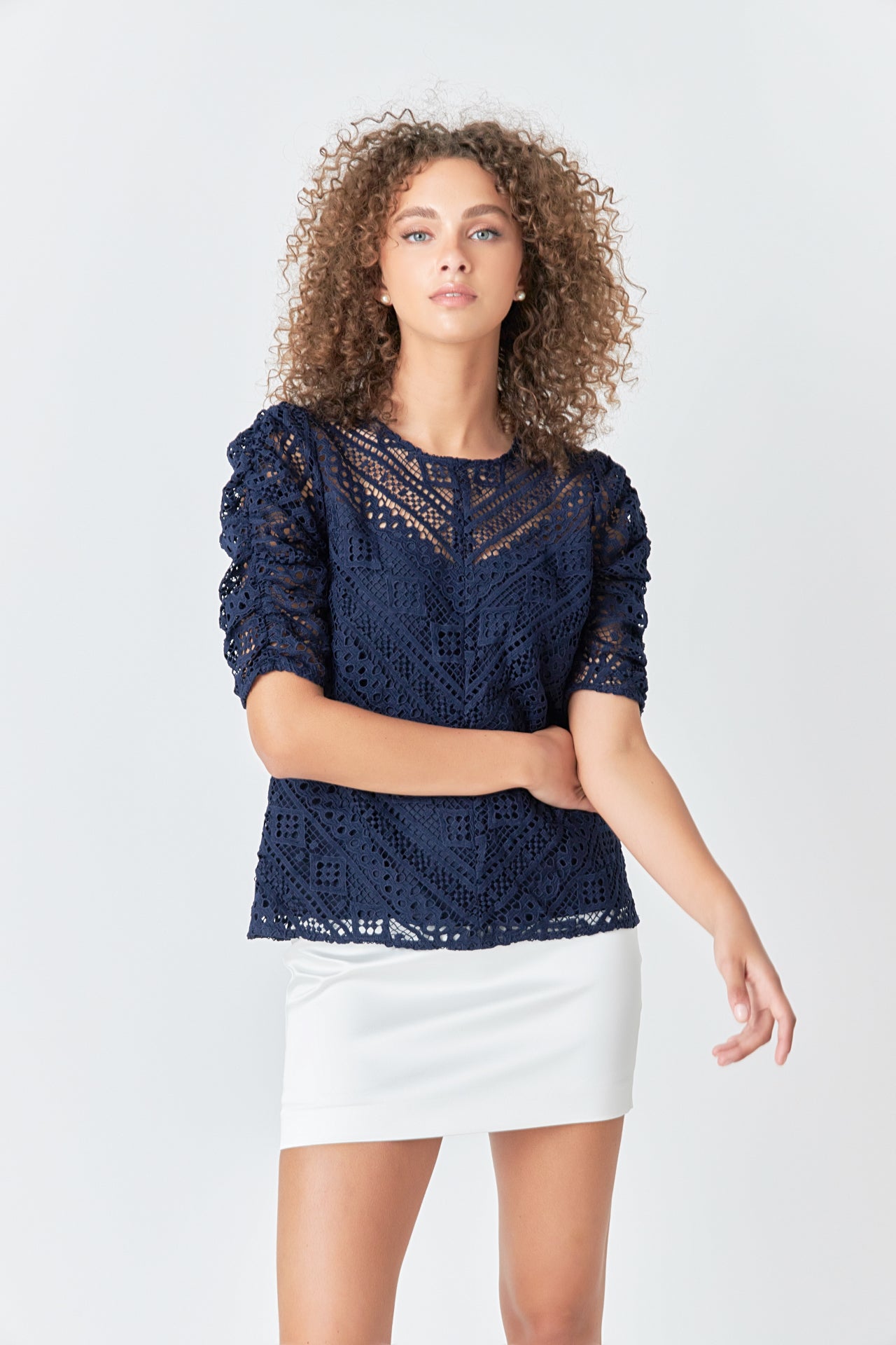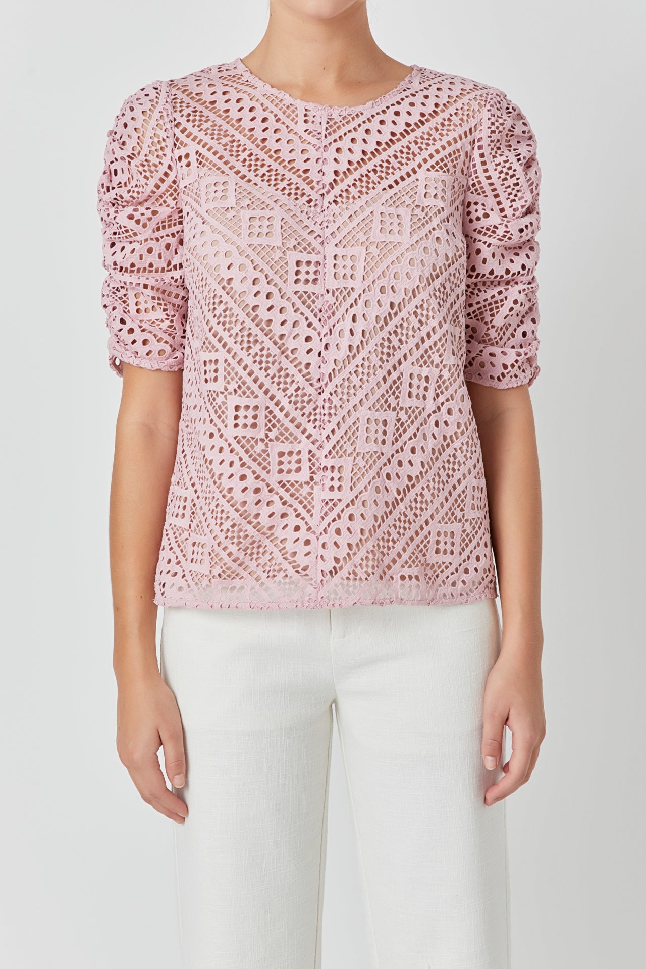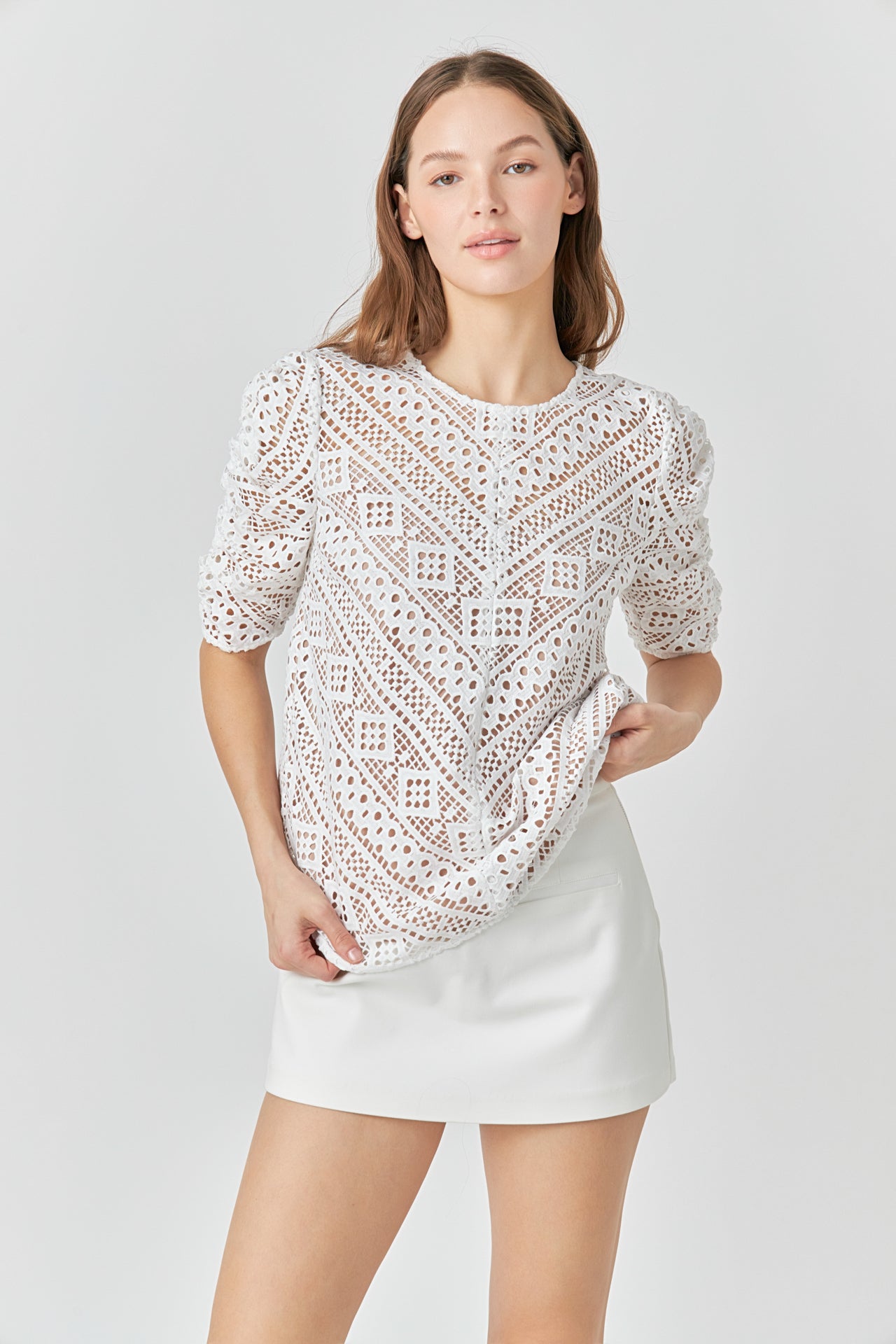 This sweet Embroidered Lace Top can be styled for work or leisure. The ruched sleeves accent the intricate lace pattern while the attached lining protects your modesty. Pair with your favorite jeans mini skirt skort and so much more!