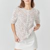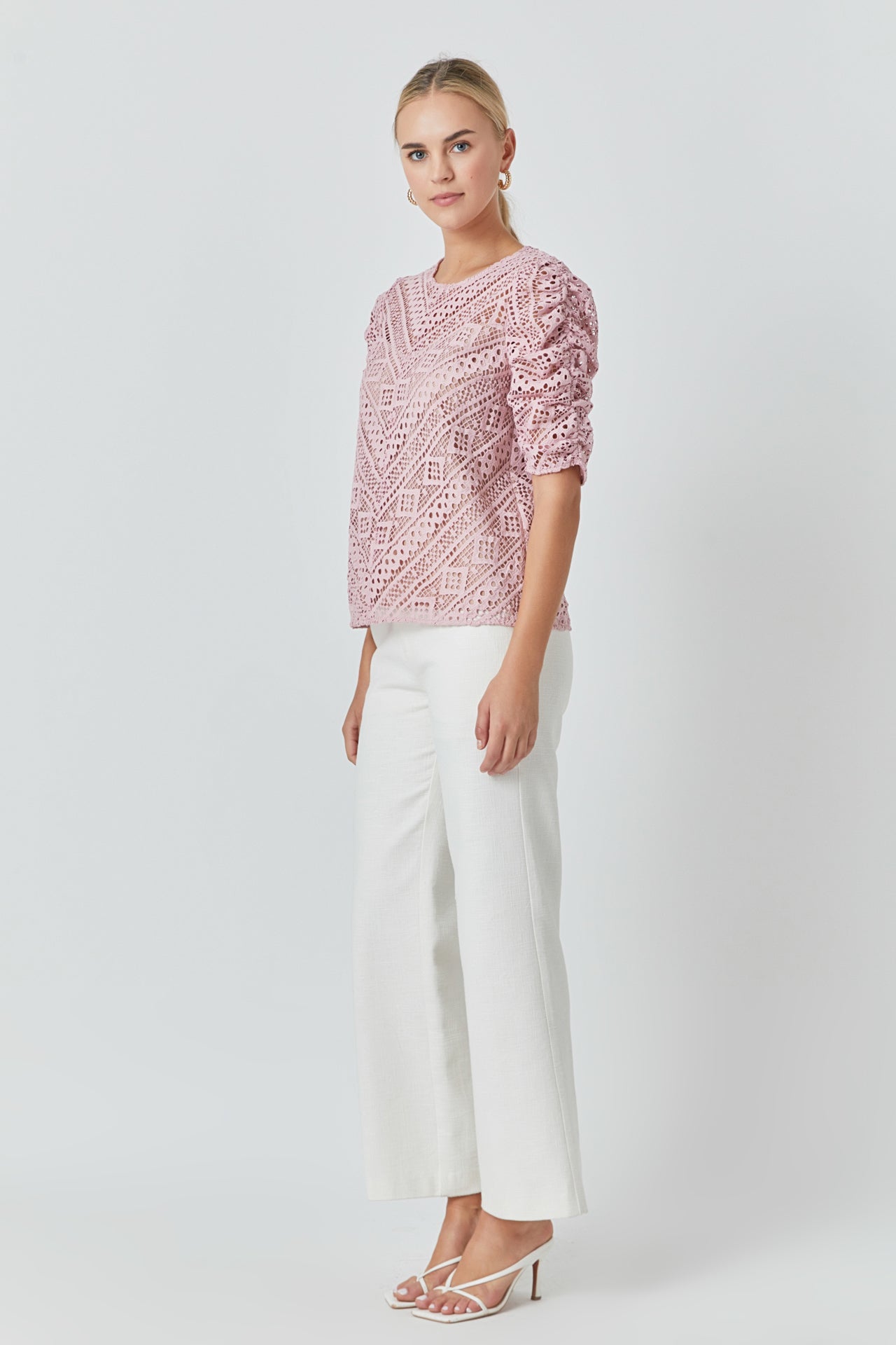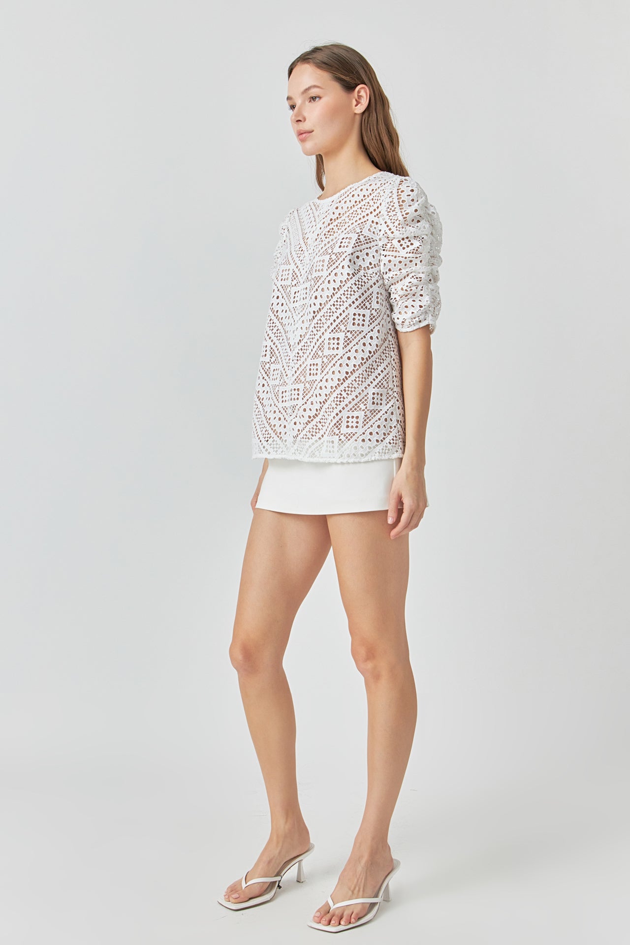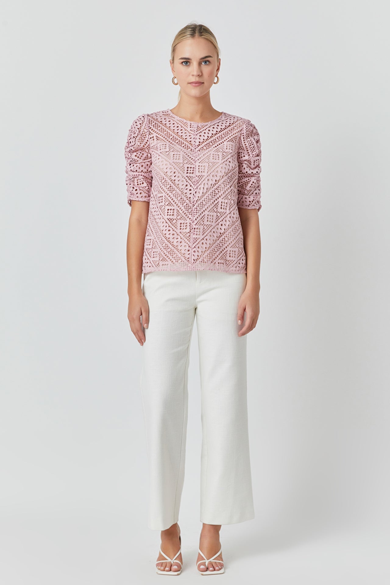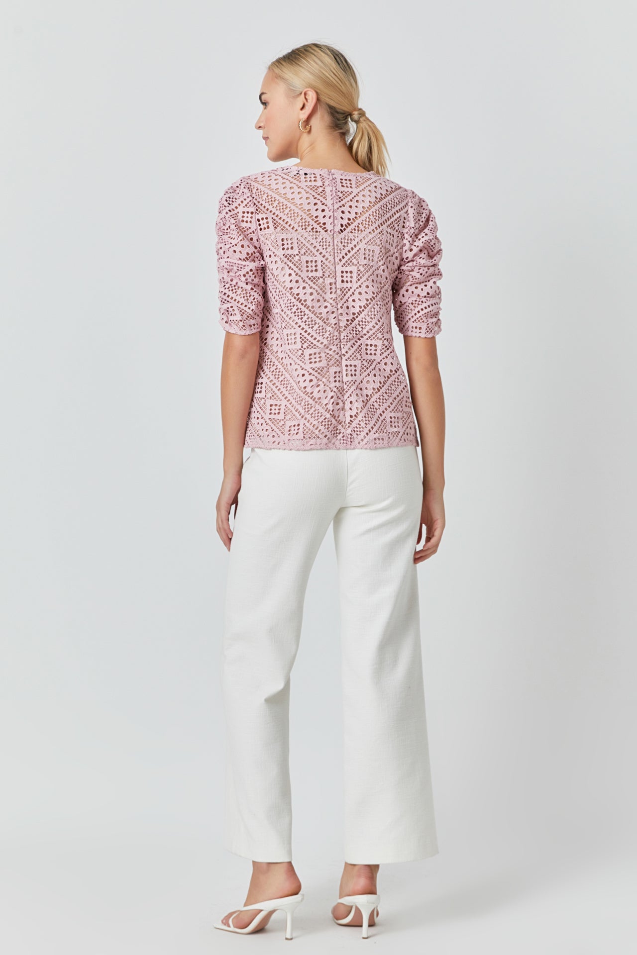 This sweet Embroidered Lace Top can be styled for work or leisure. The ruched sleeves accent the intricate lace pattern while the attached lining protects your modesty. Pair with your favorite jeans mini skirt skort and so much more!