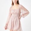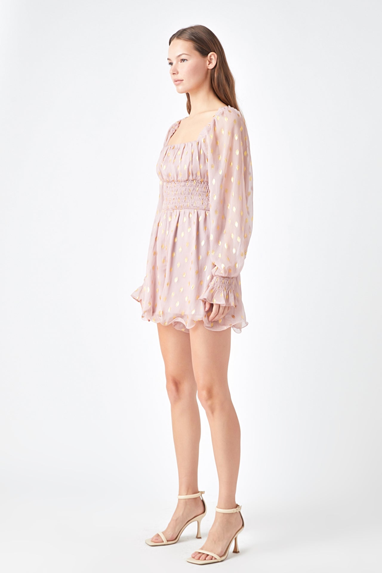 This Foiled Dot Long Sleeves Romper is an elegant, sophisticated choice for any special occasion. It features an all-over foiled dots print, an elastic waist, smocking detail on the sleeve hem, and a romper design for a unique, fashionable look.