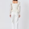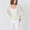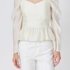 This top is the perfect way to add some elegance to your wardrobe. The pleated fabric peplum hem and button accents on the sleeves create a timeless and graceful piece. Pair with your favorite trousers for work or a mini skirt for a night out.