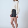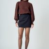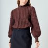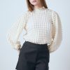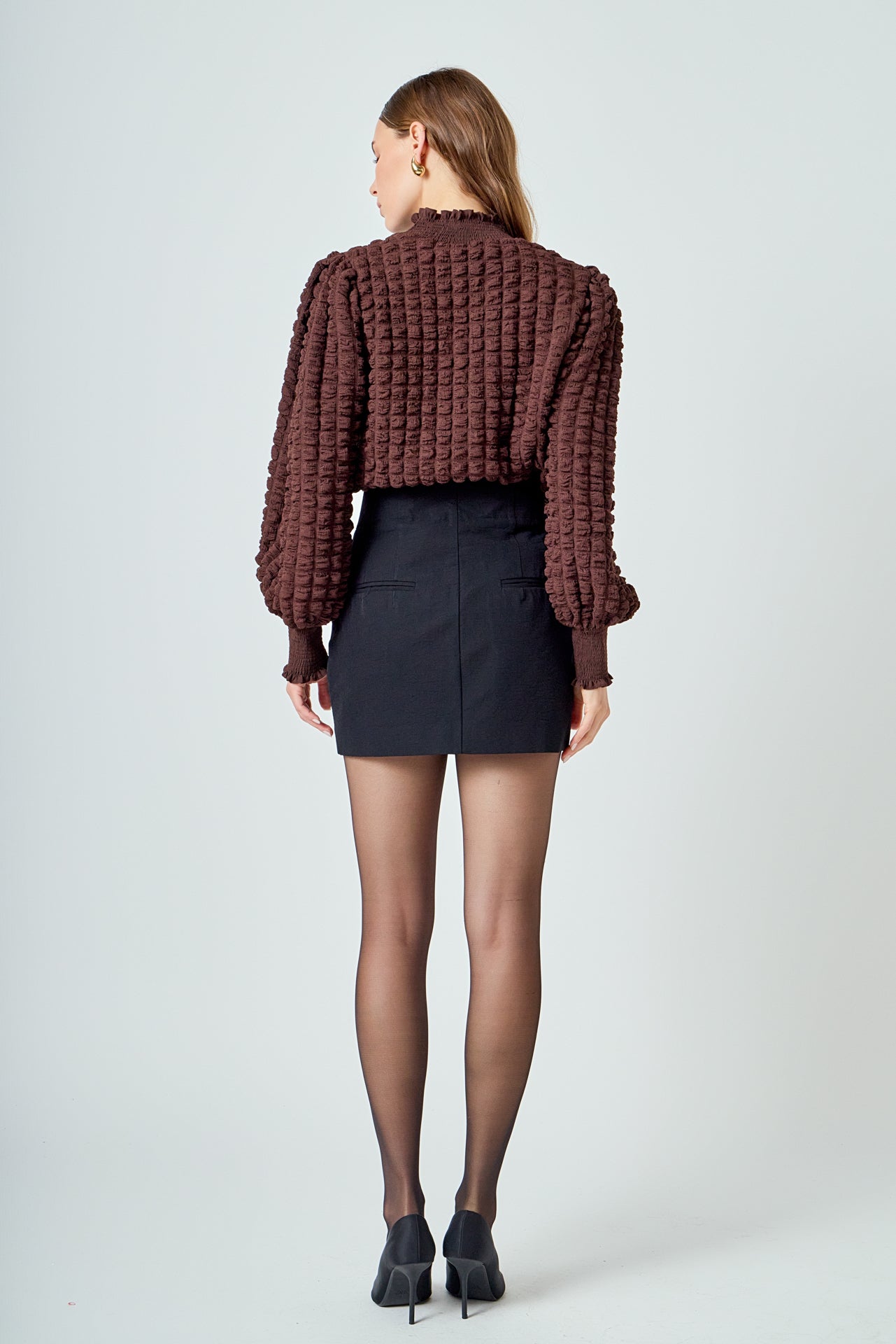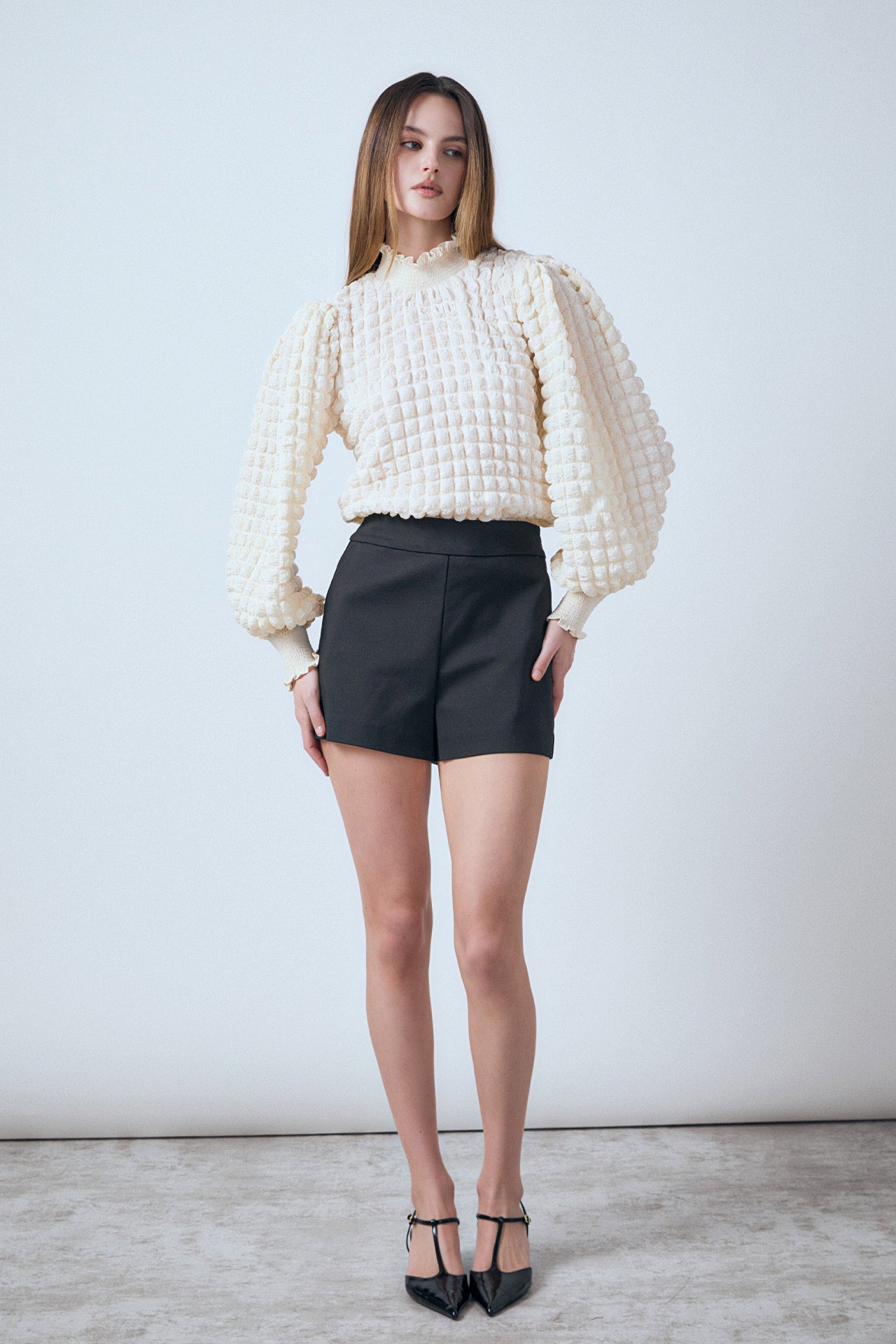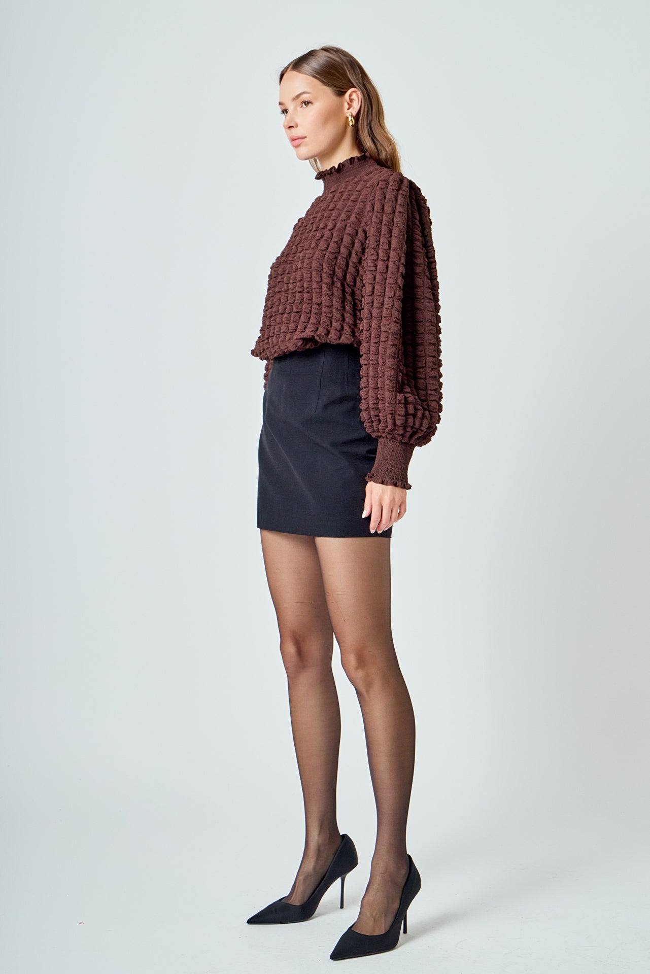 An elegant blouse that you can wear to work and then to date night. The unique textured fabric will catch your eye with this piece. You’ll also admire the blouson sleeves and mock neck that create a graceful style. Pair this mock neck top with trousers for work and then tuck it into a mini skirt for date night.