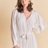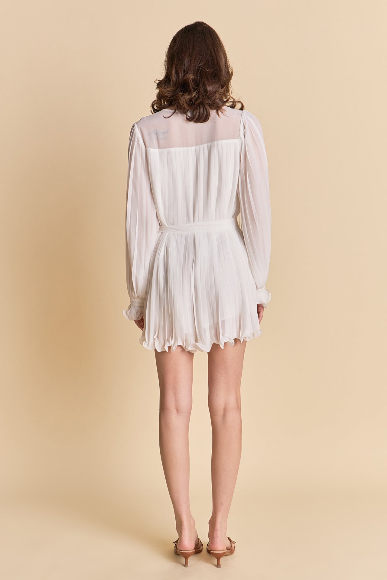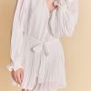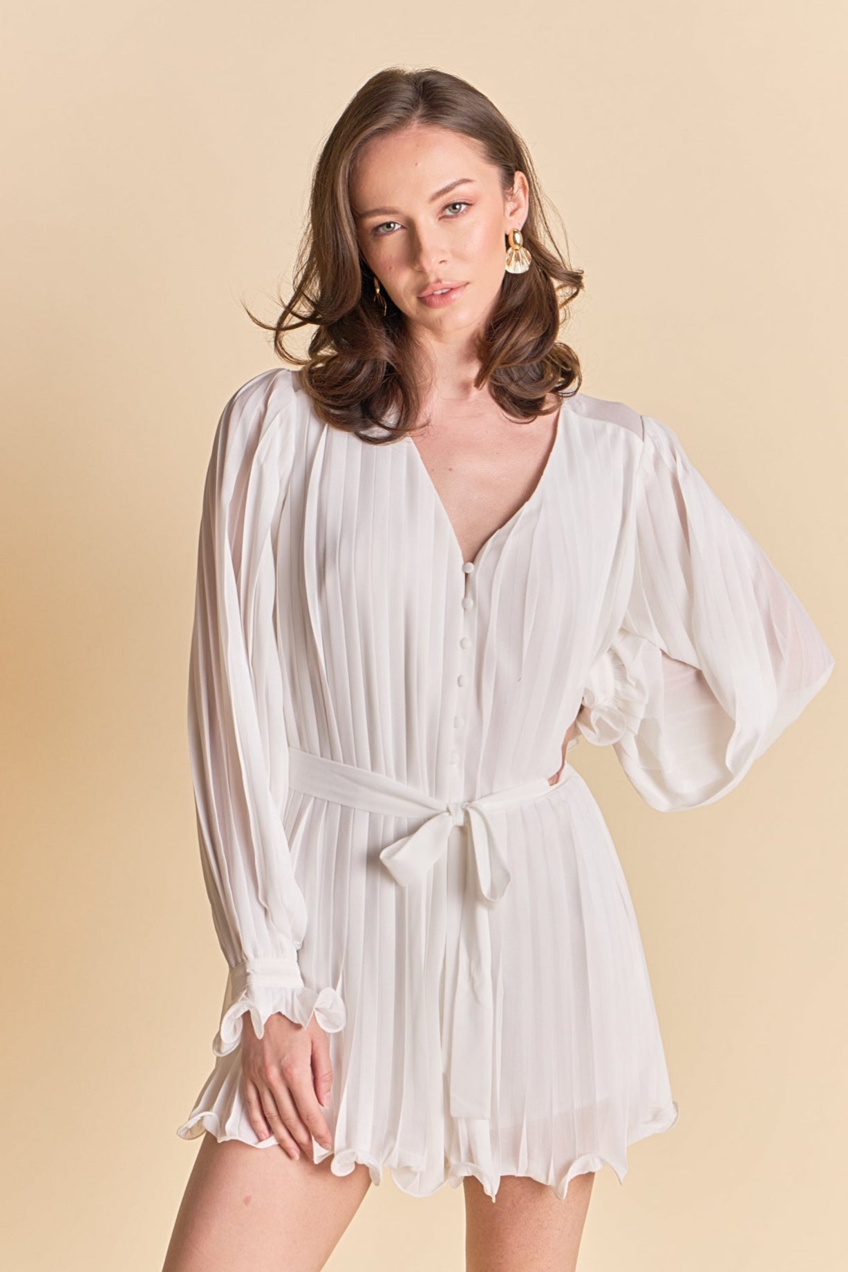 This stunning pleated romper is perfect for a day out in the sun or a night out on the town. Features include a button-up detail a v-neckline pleats and banded sleeves for a look that is chic and timeless. Perfect for introducing a little elegance to your look this unique romper is sure to drive sales. Stand out in this eye-catching statement piece.