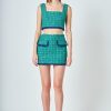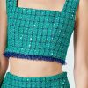 Crafted from luxurious sequin tweed and finished with delicate fringe trim, this cropped top is a standout piece that blends sophistication with a touch of sparkle. The structured square neckline adds a flattering, modern edge, while the fully lined interior ensures a smooth and comfortable fit. Perfect for pairing with the matching high-waisted skirt or tailored trousers, this versatile piece transitions seamlessly from day to night, making it a chic addition to any wardrobe.