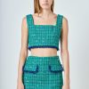 Crafted from luxurious sequin tweed and finished with delicate fringe trim, this cropped top is a standout piece that blends sophistication with a touch of sparkle. The structured square neckline adds a flattering, modern edge, while the fully lined interior ensures a smooth and comfortable fit. Perfect for pairing with the matching high-waisted skirt or tailored trousers, this versatile piece transitions seamlessly from day to night, making it a chic addition to any wardrobe.