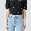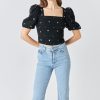 This elegant Sequins Floral Embroidery Top is crafted with exquisite detail. Featuring a square neck for a modern take on the classic look short puff sleeves center back conceal zipper closure and stunning sequin floral embroidery this top will turn heads.
