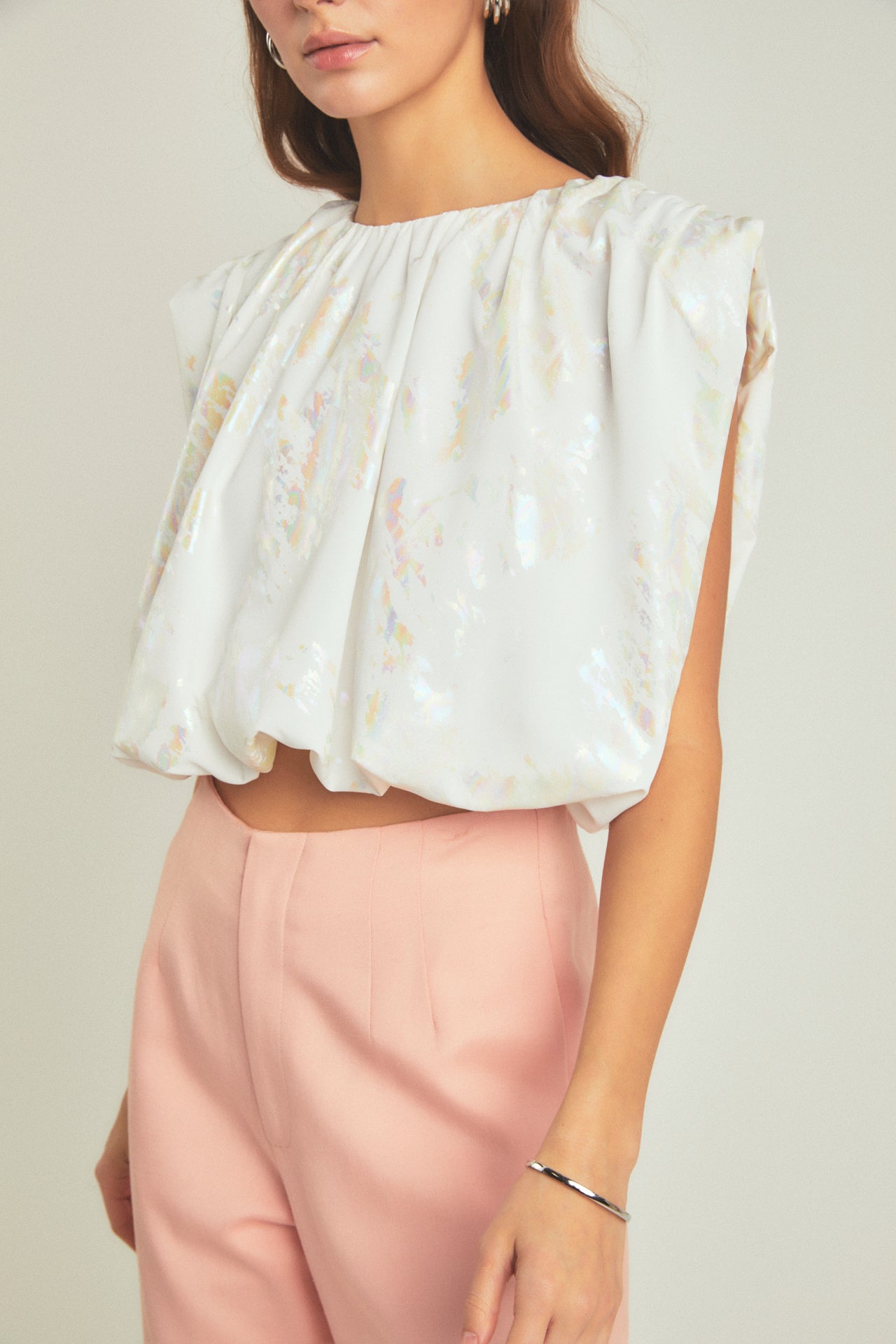 Glam up your wardrobe with our Printed Foil Sleeveless Top! Featuring a glistening foil print, this top will make you stand out from the crowd. The round neck design adds a touch of sophistication while the cropped length keeps it trendy. Made with a sleeveless design, it’s perfect for warmer days or layering with a jacket. Style it with high-waisted jeans or a skirt for a chic look. Don’t miss out on this statement piece that will elevate any outfit. Dazzle in our Printed Foil Sleeveless Top, a must-have for your closet!
