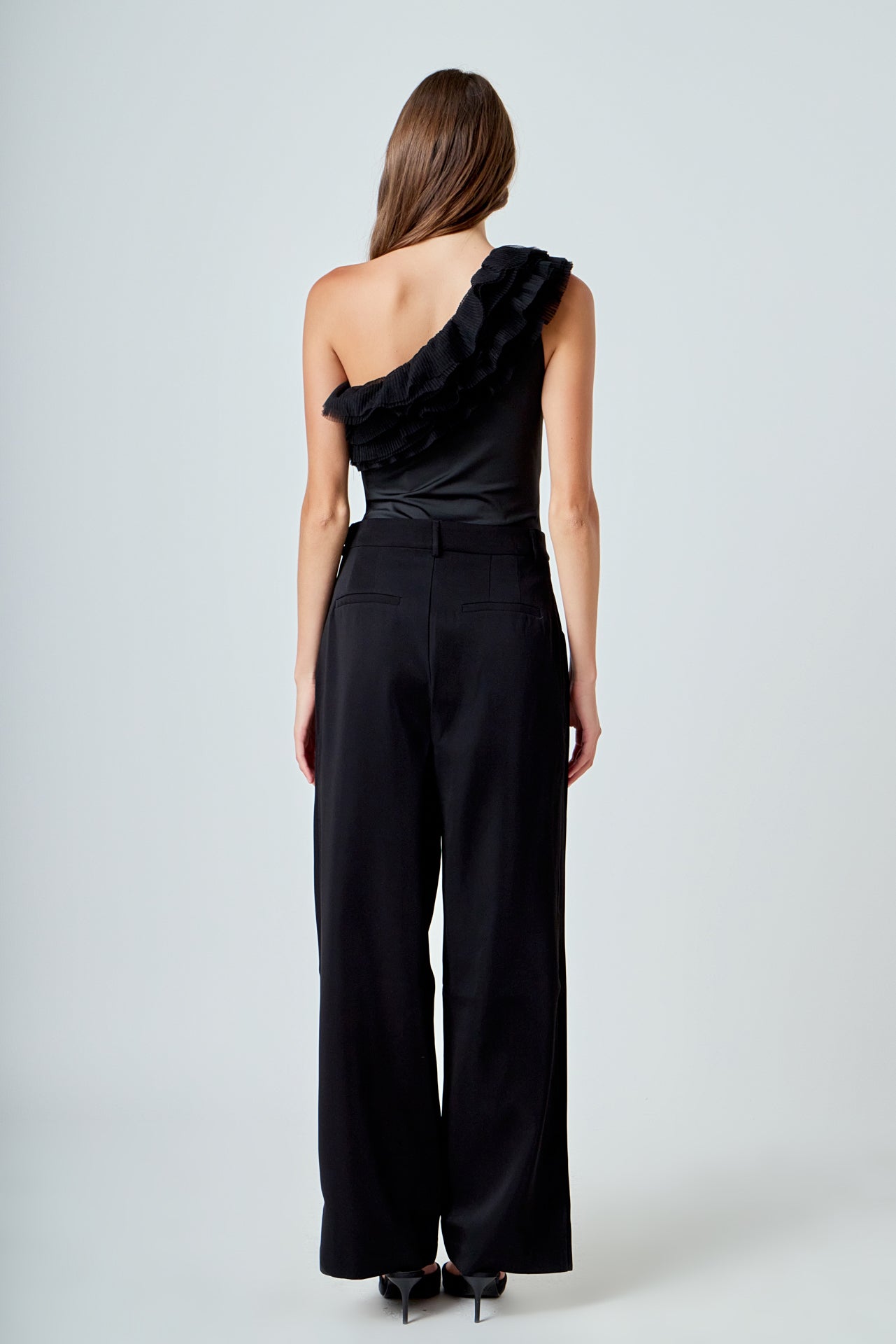 Take your style to the next level with this ruffled asymmetrical bodysuit. No need to worry about tucking or readjusting. This sleek fitted bodice has a striking asymmetrical shoulder and a delicate ruffled neckline for a touch of sophistication. It’s the perfect way to add an unexpected twist to your wardrobe morning noon or night!