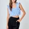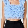 This Ruffled Shoulder Strap Tulle Top will add a bit of class and sass to your wardrobe. Featuring a cropped length sleeveless top and delicate ruffled shoulder straps it’s the perfect addition to any outfit. Add it to a skirt or dress or simply style it with jeans and heels.