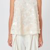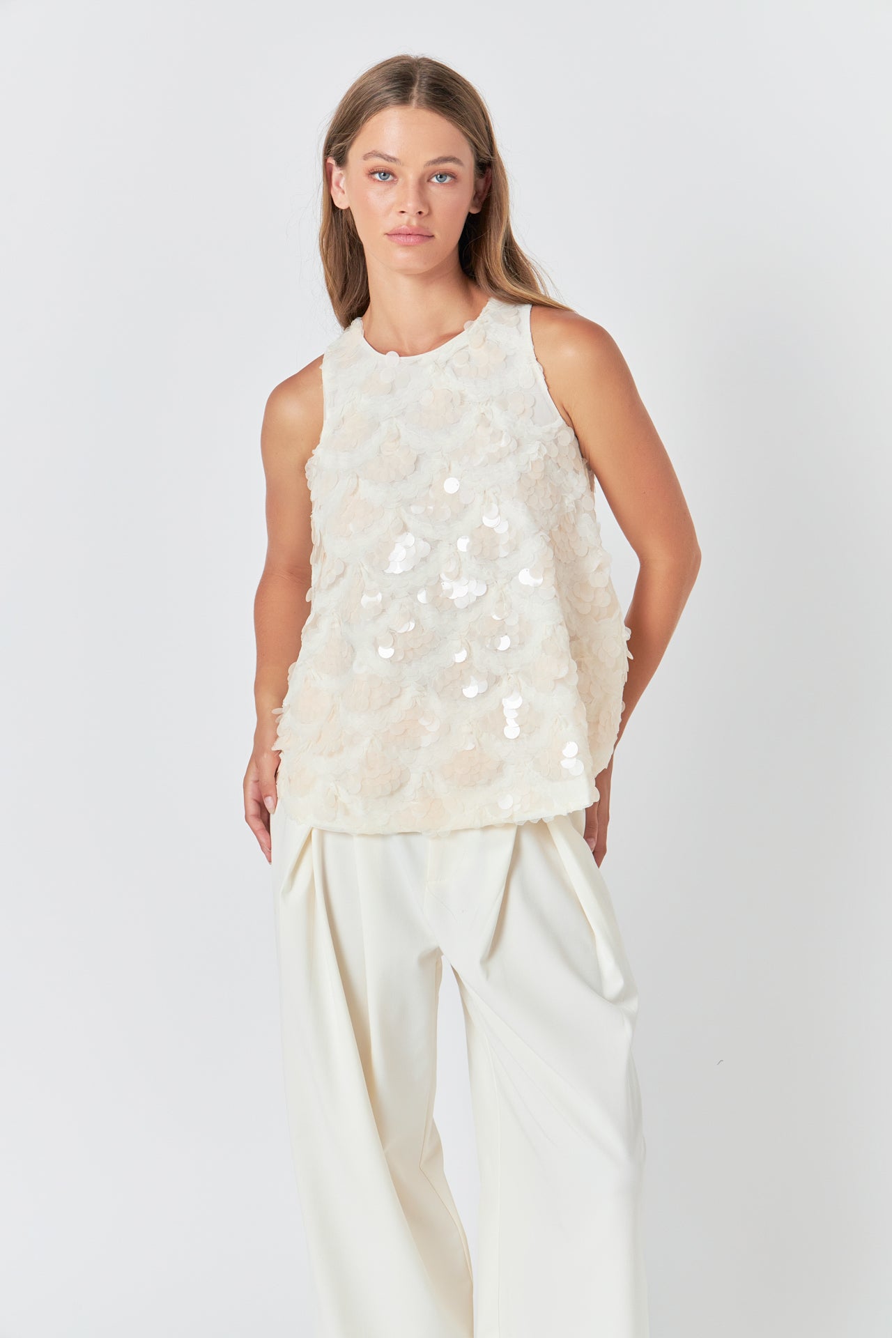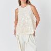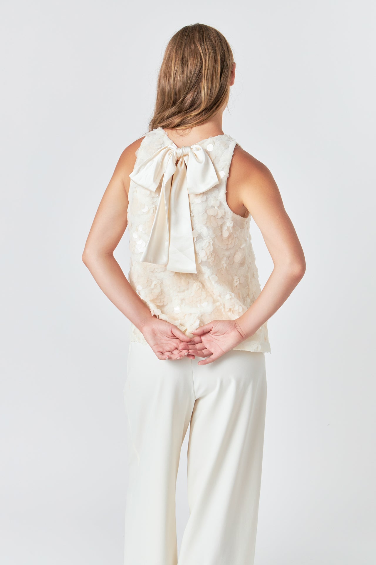 With mesh and sequin fabrication, this endless rose top is designed with an intricate scallop pattern and is fully lined to ensure optimal comfort. On the back, there’s a keyhole detail accented with a large satin bow that adds to the sophisticated femininity of the piece.