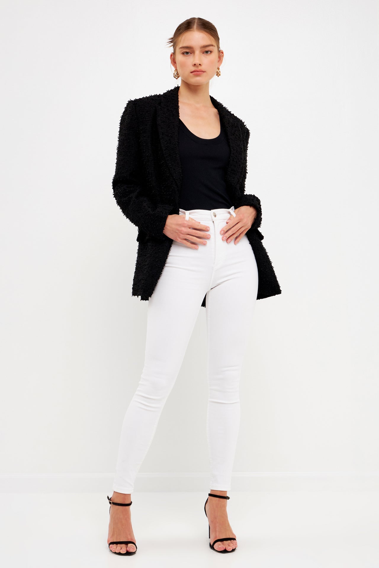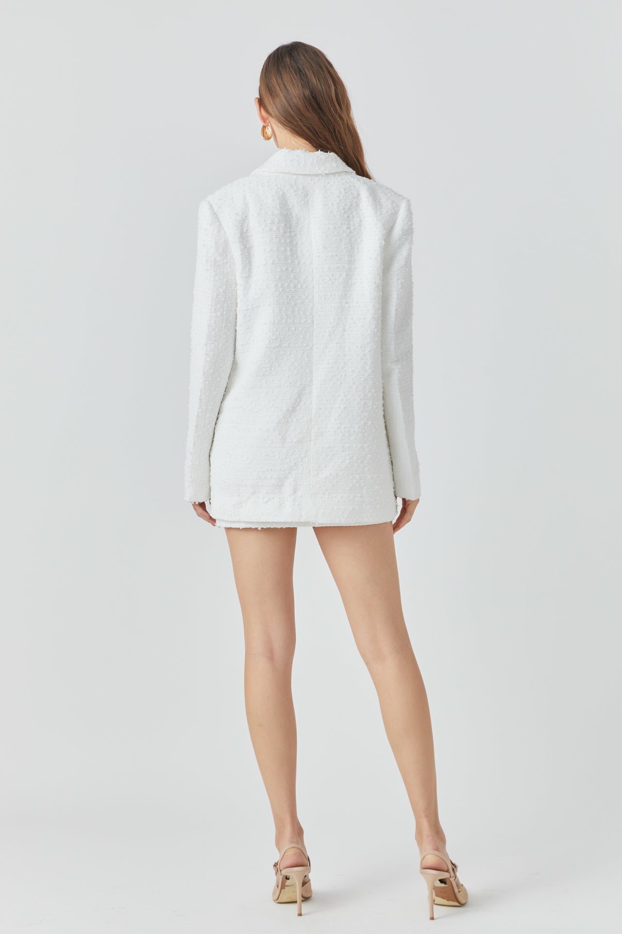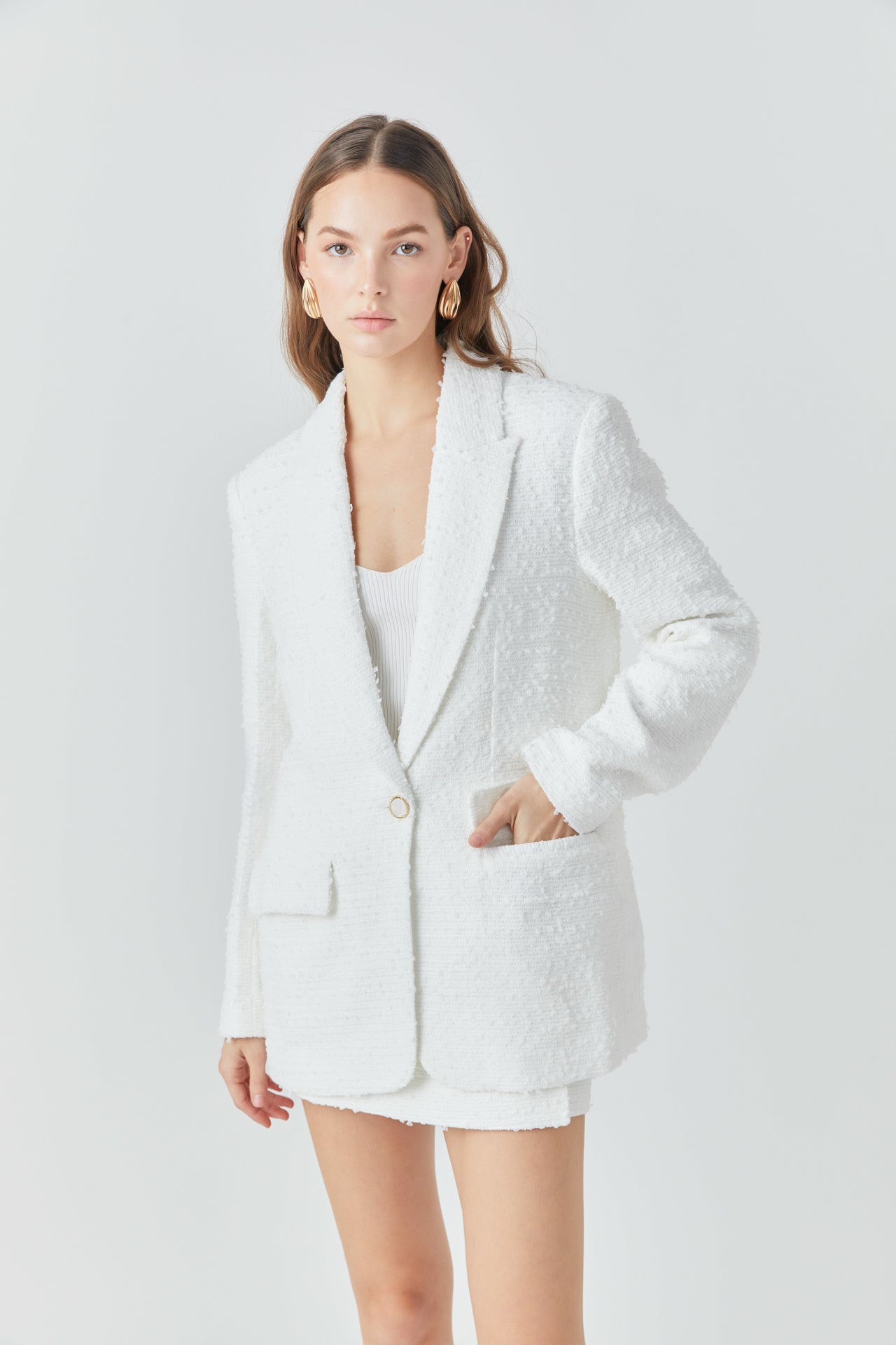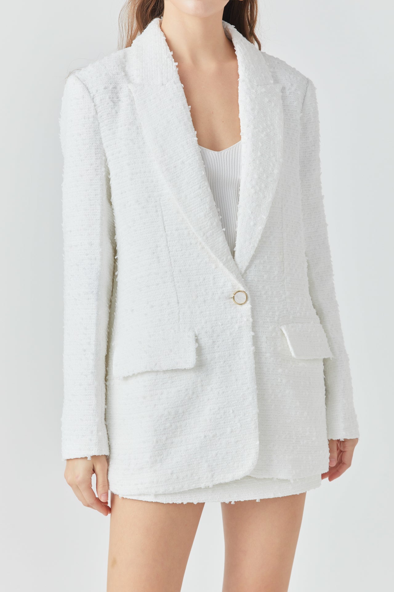 A blazer that you can wear to work and then to dinner with friends. This blazer from endless rose is just the right amount of sophistication and style. The tweed fabric, peak lapels, and front pockets give it a classic look, while the boyfriend fit offers a modern twist. Pair with the matching mini skirt and tights for the office, or wear it with jeans for a more casual look.