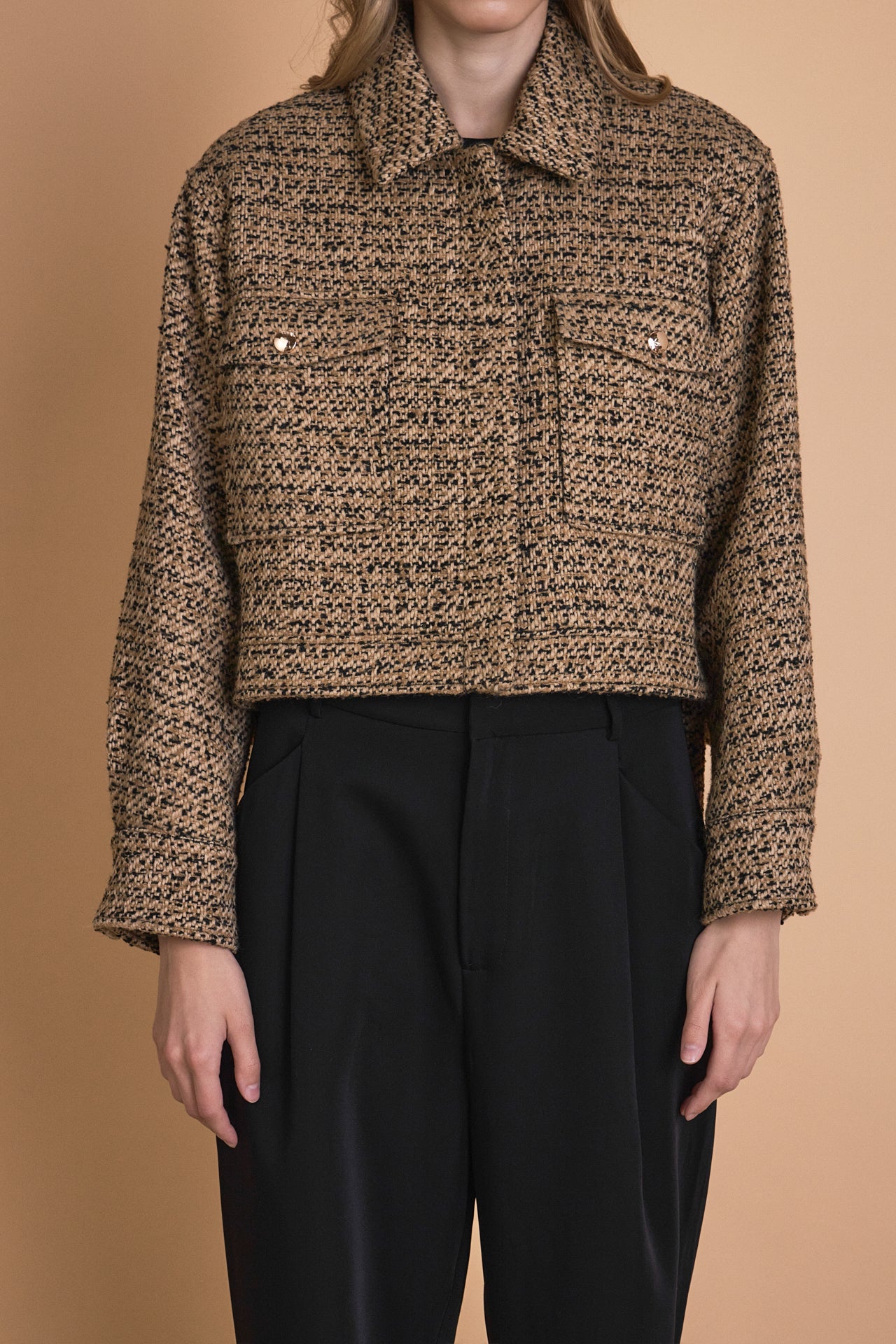Stay stylish and cozy with our Tweed Cropped Jacket. Made with high-quality tweed fabric, this jacket exudes sophistication and elegance. The cropped design adds a modern touch, while the classic collar and front chest pockets provide functionality. Pair it with high-waisted pants and boots for a chic and versatile look. Whether for work or a night out, this jacket is perfect for any occasion. Don’t miss out on this unique piece that will elevate your wardrobe. Shop now and experience the timeless appeal of our Tweed Cropped Jacket.